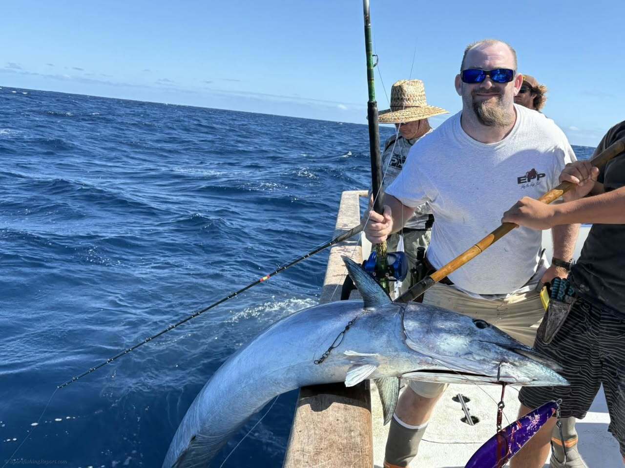Had a chance at some big wahoo this morning. Grant with a 74,5 pounder and Eric with his signature EPP wrapped rod and a 64.5 pound wahoo. The others were nice too. Every fish is celebrated!!!!