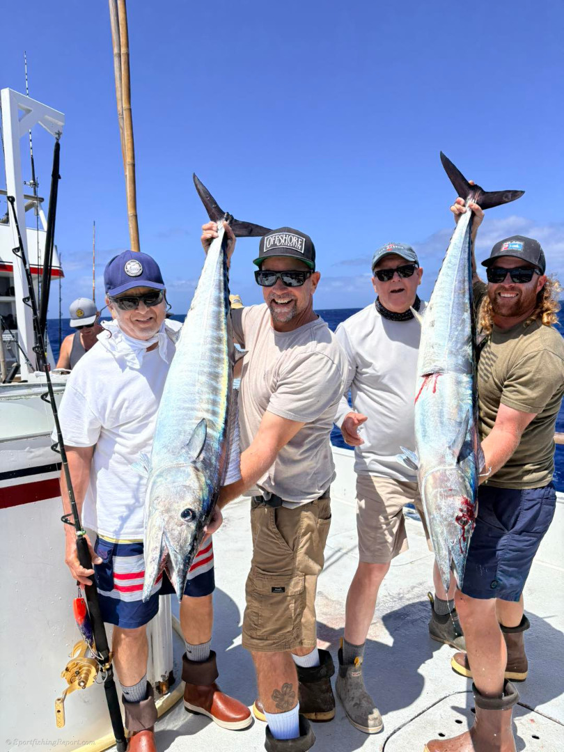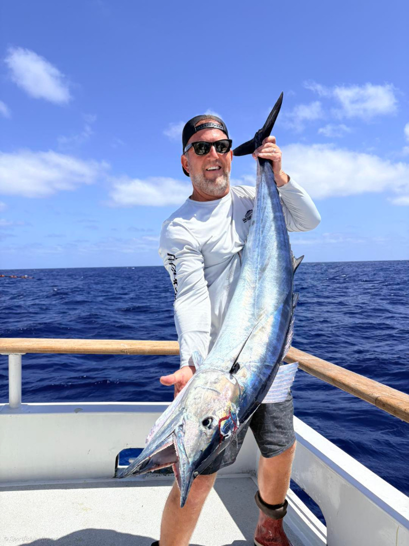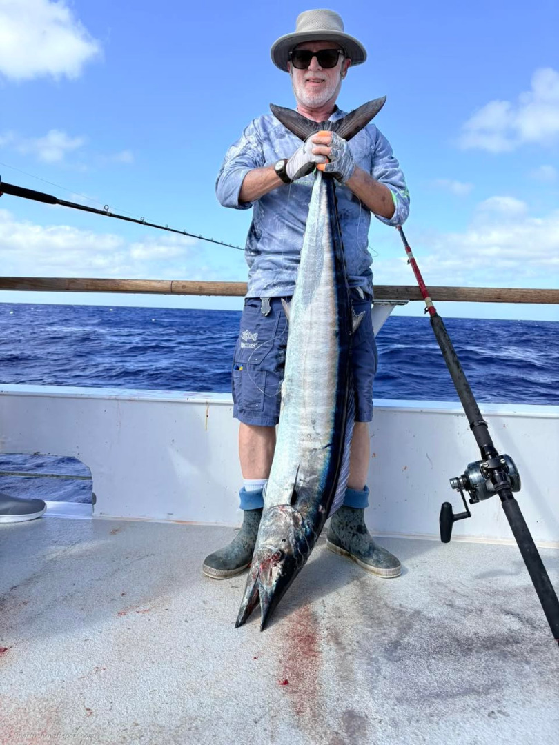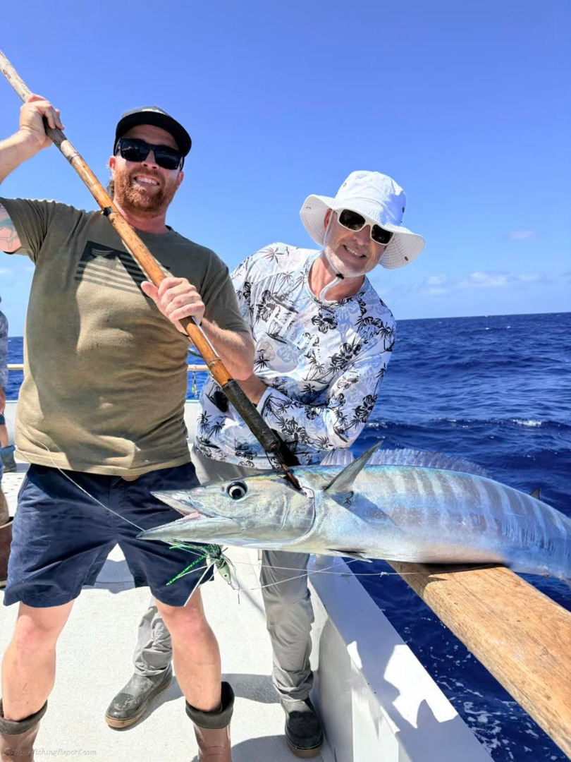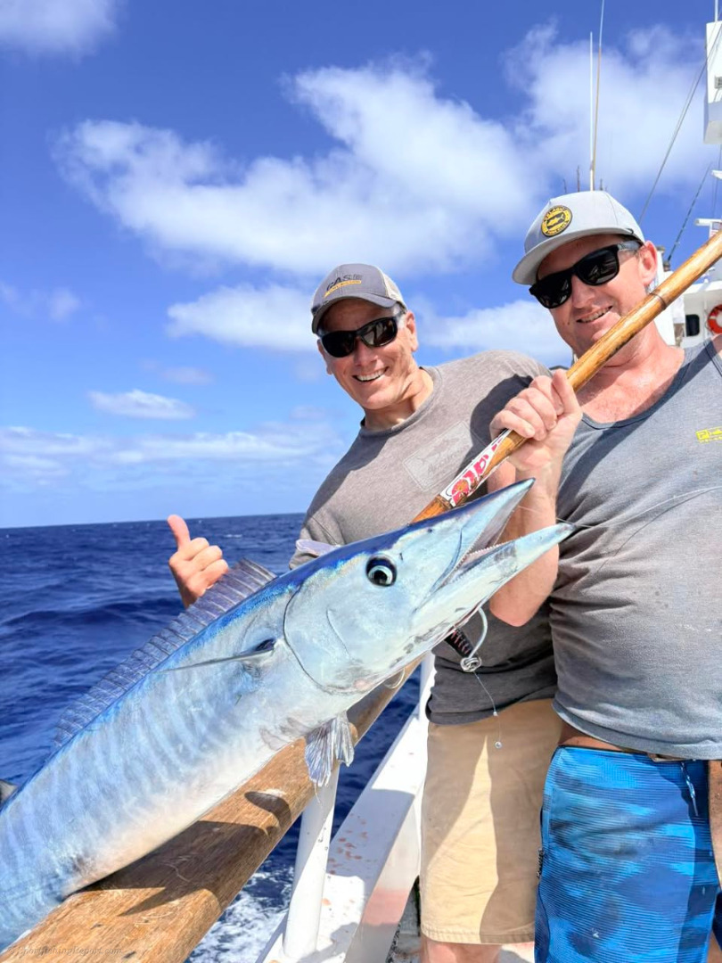 Wahoo bonanza today with a couple of nice tuna for a nice first day at the Bank. Conditions looked good today and hoping to get some bait for the kite tonight. No complaints today . Good weather and good wahoo fishing to start the trip!