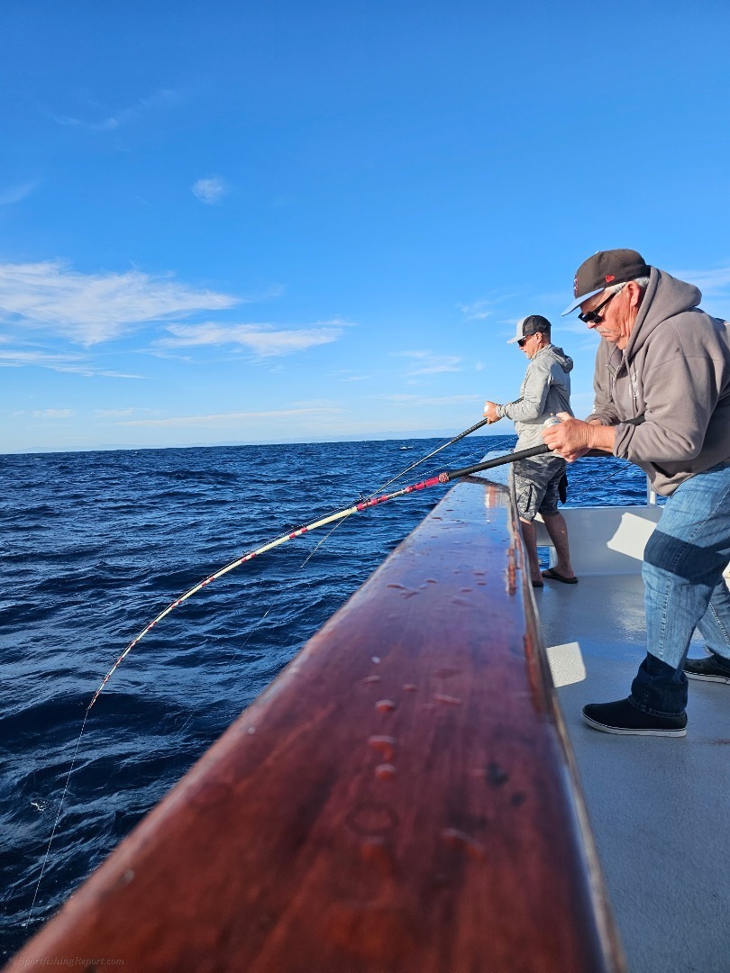We started our morning along the coast looking for yellowtail, and while the birds and life showed up around 8:00 AM, the biting window was short-lived. By 10:00 AM, the yellowtail had shut off completely. After grinding through the shallows for a few hours with no luck, we made the call to head back offshore. We found the bluefin right as the sun was going down! We’re now sitting just a few fish away from bluefin limits. Tomorrow we will be focusing on hitting our limit and looking for yellowfin tuna.